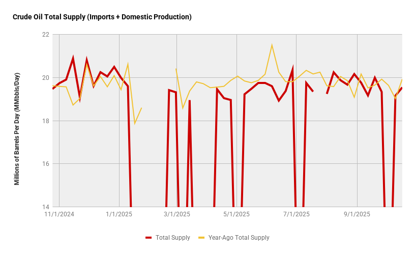 Total crude oil supply is composed of imports plus domestic production. The two typically trade in a reciprocal fashion with crude oil imports increasing as domestic production wanes, and vice versa.